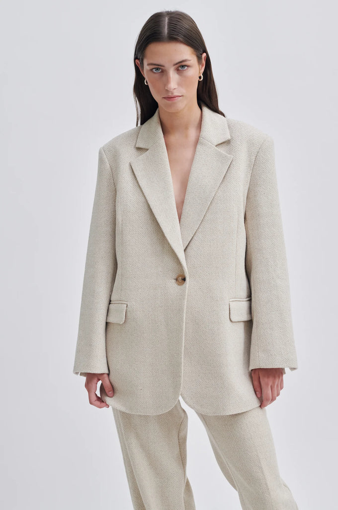 Second Female herringbone blazer. Made in a soft fabric blend with a woven herringbone pattern. Featuring a wide notch lapel and single-button fastening at the front. Padded shoulders and long sleeves with slits at cuffs. Two flap pockets at the front. Slit at back. Fully lined. Loose and drapey fit.