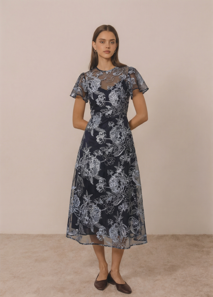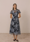 Introducing the Emilia Dress in Blue by Charmaine Reveley—a beautiful choice for your most memorable occasions. This elegant midi dress features delicate fluted short sleeves and a exposed metal zip fastening at the back, creating an understated yet refined silhouette. Crafted from luxurious lace, it's designed to make an impression at weddings and summer celebrations.