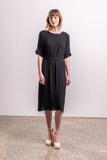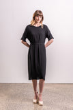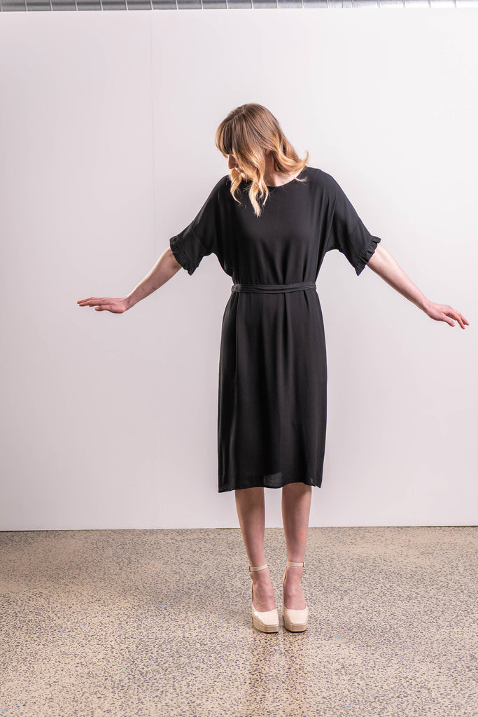 A classic oversized dress with a cut on sleeve and a delicate ruffle at the end. The dress comes with a removable waist tie, so can be worn tied at the waist or as an elegant sack dress. There is a keyhole button at the back to ensure east fit. Kiki is a great choice for day to day or to work.