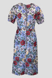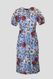A highneck dress with a straigh cut skirt which ends below the knee. Cute puff sleeves and an metal zipper up in the back. This dress fits true to size.