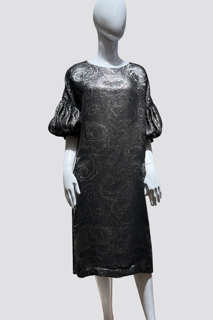 A lovely knee lenght dress with a high neck and a drop shoulder. The dress has a balloon sleeve which gathers with a drawstring. The Heather is a fun fashion statement for summer, good for events or dinners out.
