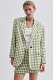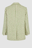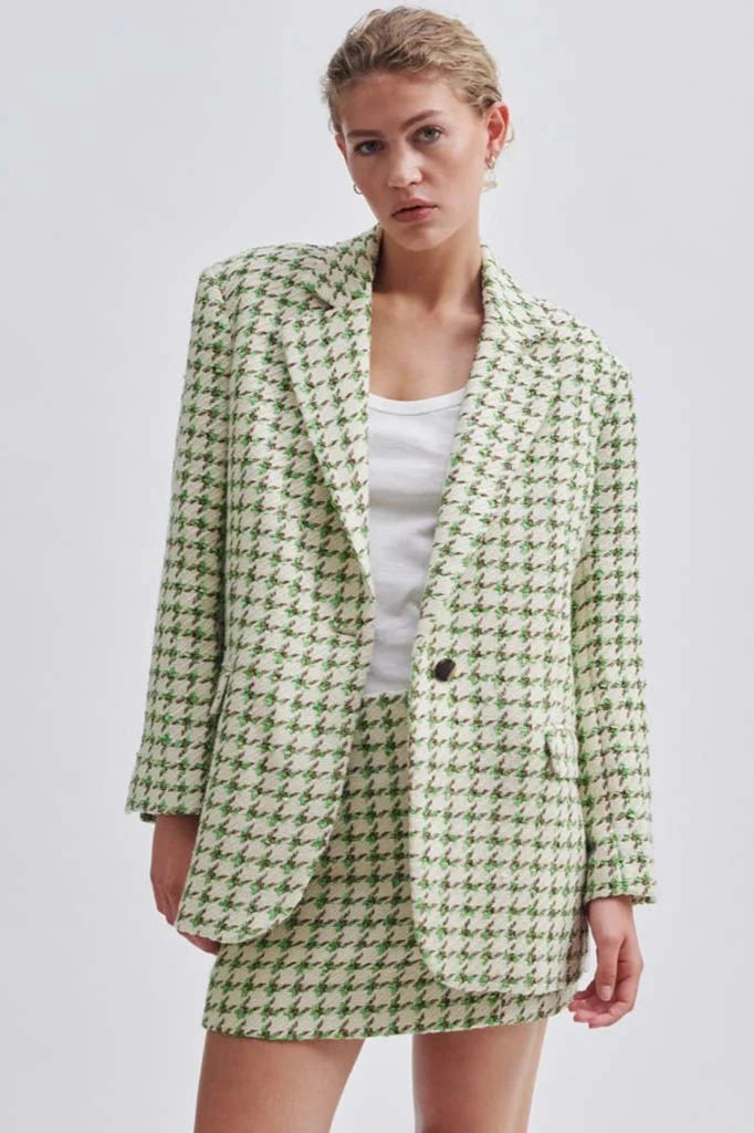 Second Female patterned blazer. Made in a colourful tweed fabric with textured finish. Featuring a wide notch lapel and single-button fastening at the front. Padded shoulders and long sleeves with slits at cuffs. Tailored seams at front and back. Two flap pockets at the front and single inside pocket. Slit at back. Fully lined. Loose, wide fit with relaxed, drapey silhouette.
